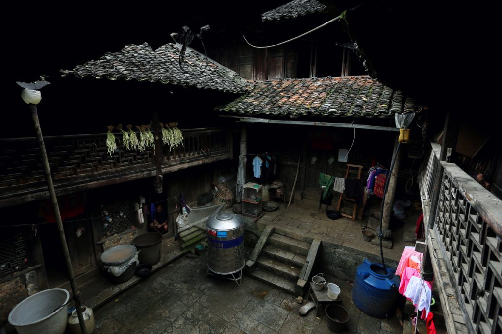 Il donne sur une cour pavée intérieure et trois édifices en bois composés d’un étage et un rez-de-chaussée, avec des toits en vieilles tuiles yin-yang.