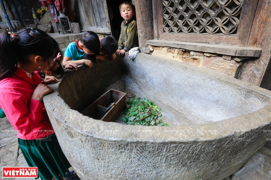 À l’intérieur de la cour, trône une baignoire en pierre. Bien qu’immense, la demeure est typique des maisons traditionnelles Mông. L’édifice principal situé en face du portail abrite l’autel des ancêtres et l’espace commun de la famille. L’édifice situé à droite du portail abrite la chambre du maître de la famille tandis que la chambre des enfants et des petits enfants est situé dans l’édifice à gauche.