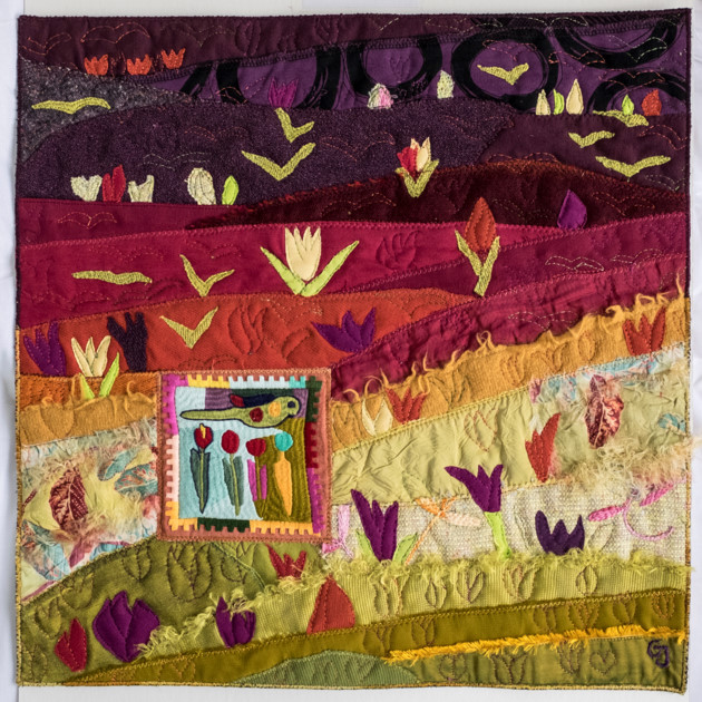 Catherine Juillerat allie dans ses broderies la modernité et la tradition. L’oeuvre: Au rythme du printemps.
