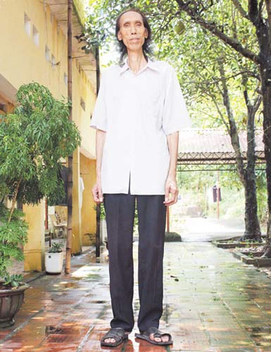 Voici maintenant quelques cas d’exception. Avec 2 mètres 28 et 115 kilos, Tran Thành Pho est entré dans le Guiness du Vietnam pour sa taille extraordinaire. Tout était normal pour lui avant 1972. A l’époque, âgé de 25 ans, M. Pho mesurait 1m68 et pesait 68 kilos. C’était la guerre. Lors d’un bombardement à Quang Tri, il fut blessé à la tête et dû se cacher dans un abri souterrain ; mais heureusement, il put s’en sortir. Cependant, depuis cet accident, il subit d’un trouble de l’hypophyse et son corps ne cesse de gongler.