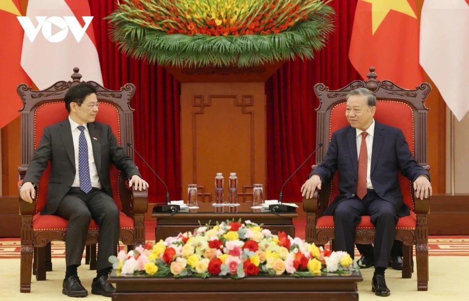 Le secrétaire général du Parti communiste vietnamien Tô Lâm et le Premier ministre singapourien Lawrence Wong. Photo: VOV |