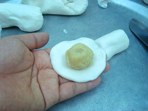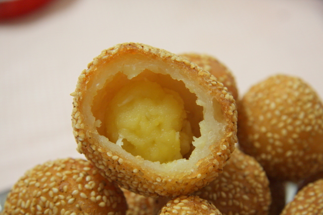 Ailleurs en Asie, on fourre les boules frites de sésame soit à la pâte de haricots rouges, de haricots noirs, de pâte de graines de lotus, avec ou sans essence de fleurs de Jasmin, ou encore de cacahuètes.