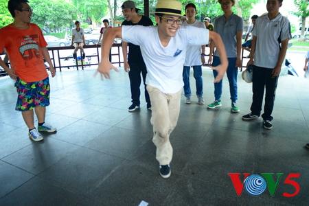 Il est près de deux heures. Maintenant, le pavillon est plein de monde. Pas de danseurs professionnels, ici. Il n’y a que des amateurs, une soixantaine en tout, venus participer au concours. Selon Vu Trung Thu qui est l’un des premiers poppers du Vietnam, ce concours découle de la volonté des participants. Chaque candidat apporte sa contribution. Ensuite, l’argent ainsi collecté constitue la récompense du vainqueur. Elle est d’ailleurs toute symbolique, cette récompense et elle ne vaut pas le plaisir qu’éprouvent tous ces jeunes à s’éclater en dansant le Funk style. Du reste, ce concours est avant tout une occasion d’échanger entre Poppers et de faire la promotion du Funk style. Vu Trung Thu :