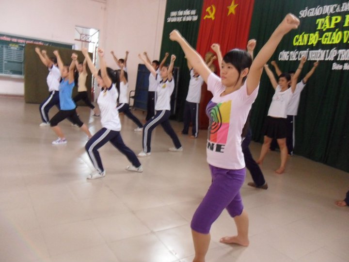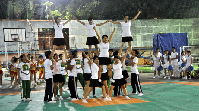 Imaginez la scène : une trentaines de filles portant des minijupes blanches à rayures vertes, avec des pompons à mains, maquillées, sourire fendu jusqu’aux oreilles, qui s’agitent, qui dansent, qui pirouettent... Tout cela pour le bonheur des spectateurs venus assister au match. Le club de « cheerleading » de l’Université des sciences sociales et humaines a été crée en 2002 avec au départ 7 filles. Il compte désormais 70 membres, répartis en 3 groupes, en fonction de l’âge. Thu Trang :
