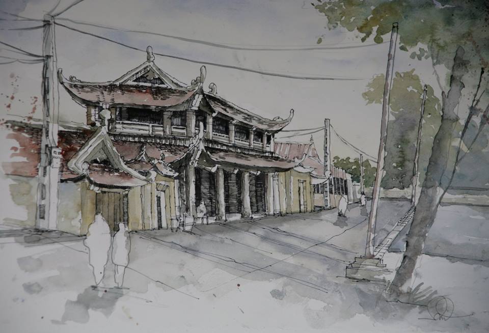 « J’ai dessiné la pagode de Hanh Thien. Elle a une porte plus étroite que celles d’autres pagodes anciennes. J’ai aussi mis en relief les motifs de décoration du pignon, qui sont vraiment représentatifs de l’architecture orientale. »