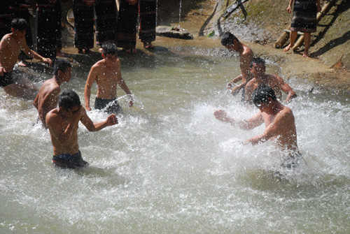 Après cette partie rituelle, les villageois, chacun à leur tour, s’approchent de la fontaine, prenant de l’eau dans des gourdes sèches qu’ils mettront dans leurs hottes et ramèneront chez eux. Ils croient en effet que cette eau leur apportera bonheur et prospérité. Le maître de cérémonie se rendra ensuite dans chaque famille, accompagné d’un cortège qui chantera pour apporter chance à celle-ci. Enfin, tout le monde se retrouvera à la maison communautaire pour festoyer, boire et danser au son des gongs.