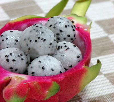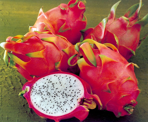 Le fruit se récolte un mois après la pollinisation, de décembre à mai. Avec son épiderme rose fuchsia recouvert d’écailles charnues et pointues, il peut atteindre 15 cm de long et peser 1 kilo ! L’intérieur du fruit est rempli d’une pulpe blanche ou rouge violacé, douce, parfumée et très sucrée, d’une texture juteuse rappelant celle du kiwi. Elle est parsemée de milliers de petites graines noires qu’on ne sent pas en bouche.