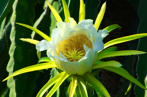 Les fleurs du fruit du dragon sont très grandes, jusqu’à 30 cm, blanches, et exhalent un parfum envoûtant. Elles éclosent sur le côté des tiges, la floraison ne dure que quelques heures entre la nuit et le lever du jour. Dès l’aube, la fleur s’altère, commence à se refermer et à se flétrir.