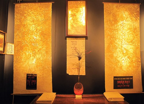 Phan Hai Bang s’est lancé dans la création d’un papier en fibres de bambou à partir de l’an 2000. 10 ans plus tard, il entreprend de le fabriquer et c’est sur ce nouveau support qu’il va décider de peindre en utilisant la technique de la sérigraphie. Ecoutons Phan Hai Bang: « Le Truc chi n’est pas du papier ordinaire. Nous allons plus loin avec l’histoire du papier. En conjuguant la méthode traditionnelle de fabrication du papier et la technique de la sérigraphie, nous avons crée une nouvelle forme d’expression qui est l’art du Trúc chỉ. »