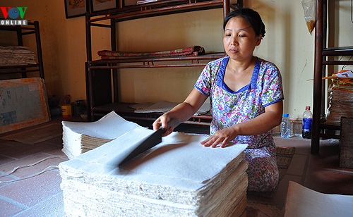 La grande originalité des estampes de Dong Ho réside dans leurs couleurs naturelles et dans le papier sur lesquelles elles sont imprimées. Il s’agit du papier dó, fait à partir d’écorce d’un arbre tropical appelé «rhamnoneuron». Ce papier est à la fois spongieux, doux, mince et résistant. Il absorbe bien les couleurs sans que celles-ci ne se mélangent pendant l’impression. L’artisan couvre le papier d’une couche de poudre de coquillage, donnant un fond blanc étincelant. Nguyen Dang Che: «Tout le matériel utilisé dans les estampes de Dong Ho vient de la nature. Le papier vient du rhamnoneuron qui pousse dans la forêt. Quant aux couleurs, le blanc vient du coquillage en mer, le rouge des cailloux en montagne, la couleur argentée vient de la fleur du sophora du Japon, le vert vient de la feuille de l’indigotier et le noir de la feuille du bambou. Toutes les estampes sont imprimées entièrement avec des planches en bois».