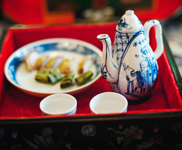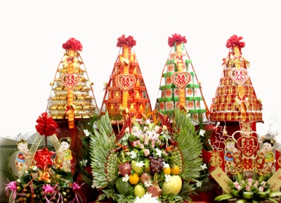 Le jour des fiançailles, donc, la famille du marié apporte des offrandes emballées dans du papier rouge, lequel est censé porter bonheur à la famille de la mariée. Les offrandes : des feuilles de bétel, des noix d’arec, de l’alcool, du thé, des friandises, des graines de lotus confites... sont portées par des jeunes garçons qui les remettront aux jeunes filles choisies avec le plus grand soin par la famille de la future mariée. Lors de ce jour donc, les jeunes filles sont habillées en ao dai, la tunique traditionnelle, tandis que les hommes sont en général revêtus d’un costume-cravate. Les parents des futurs mariés profitent de l’occasion pour fixer la date du mariage. Thanh Tam nous explique : " Les offrandes sont déposées sur l’autel des ancêtres de la future mariée. On en renvoie une petite partie à la famille du futur marié, tandis que le reste est distribué, avec le faire-part, aux amis et aux proches de la future mariée. Alors que pour la famille du futur marié, le faire-part suffit."