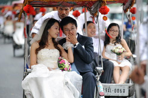 Dans le delta du Mekong, les cérémonies de mariage se diffèrent un peu. Le cortège du marié est forcément conduit par le chef de la lignée et par l’entremetteur. La coutume veut en effet que les meneurs soient 2 : un chiffre impair - 1 à fortiori - étant considéré comme néfaste au jeune couple. Vo Mai Phuong, une autre chercheuse du musée d’ethnographie : "Il y a quelques différences entre le Nord et le Sud. Dans le delta du Mekong, par exemple, lors du retour, les jeunes mariés doivent constamment se tenir la main. Ça veut dire qu’ils ne se sépareront pas, malgré les obstacles."