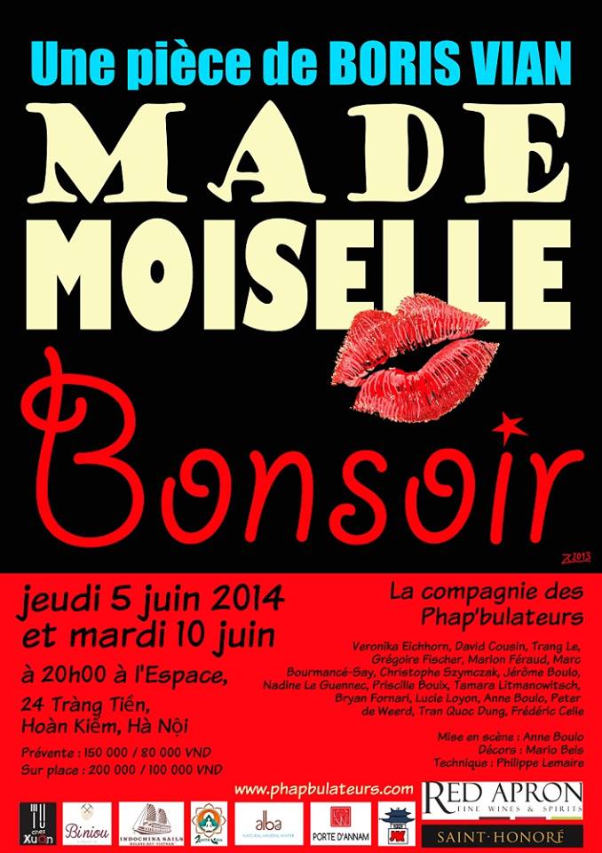 La première de « Mademoiselle Bonsoir » aura lieu à l'institut français de Hanoi, ce 5 juin et la deuxième le 10 juin, avec des sur-titrages en vietnamien. Pour plus d’informations, vous pouvez consulter sur le site du groupe : phapbulateurs.com. Vous qui allez au théâtre pour chercher du rire et des larmes, courez à l’Espace dès aujourd’hui pour avoir des billets pour ces deux soirées !