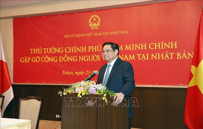 Le Premier ministre Pham Minh Chinh lors de la rencontre avec des Vietnamiens vivant au Japon (photo: Duong Giang/TTXVN) |
