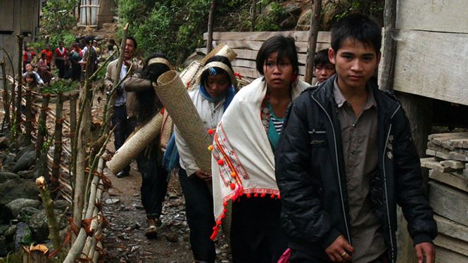 «Le premier après-midi des noces, la délégation du marié vient avec tous ses cadeaux. Le soir, la famille de la mariée abat un coq pour le repas auquel elle invitera l’autre famille. Si la forme de la tête et des pattes de la bête s’avère correcte selon les croyances populaires, alors le lendemain matin, la mariée pourra suivre son homme chez lui.», explique Chin Me Leng, un Mang du district de Nâm Nhùn.