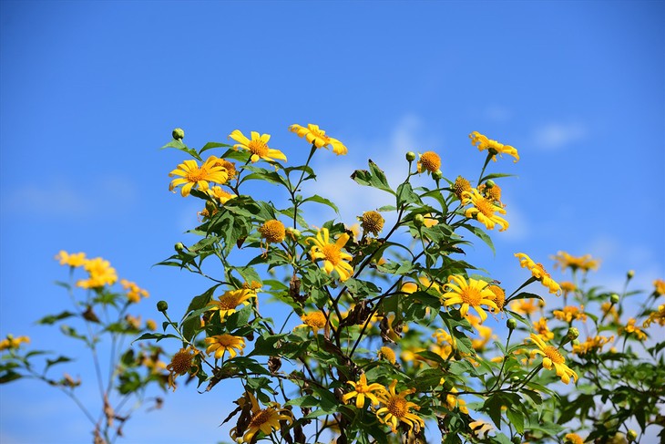 Le tournesol mexicain, une variété florale épurée, brille entre le ciel et la terre du Centre. Photo : baoquangnam.vn |