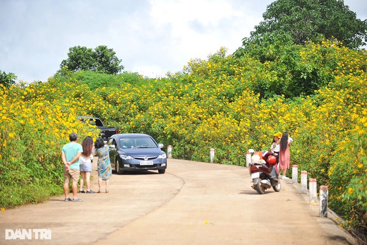 La voie menant vers le volcan Chu Dang Ya est bordée de rangées de tournesols mexicains, couleur miel. Photo : dantri.com.vn |