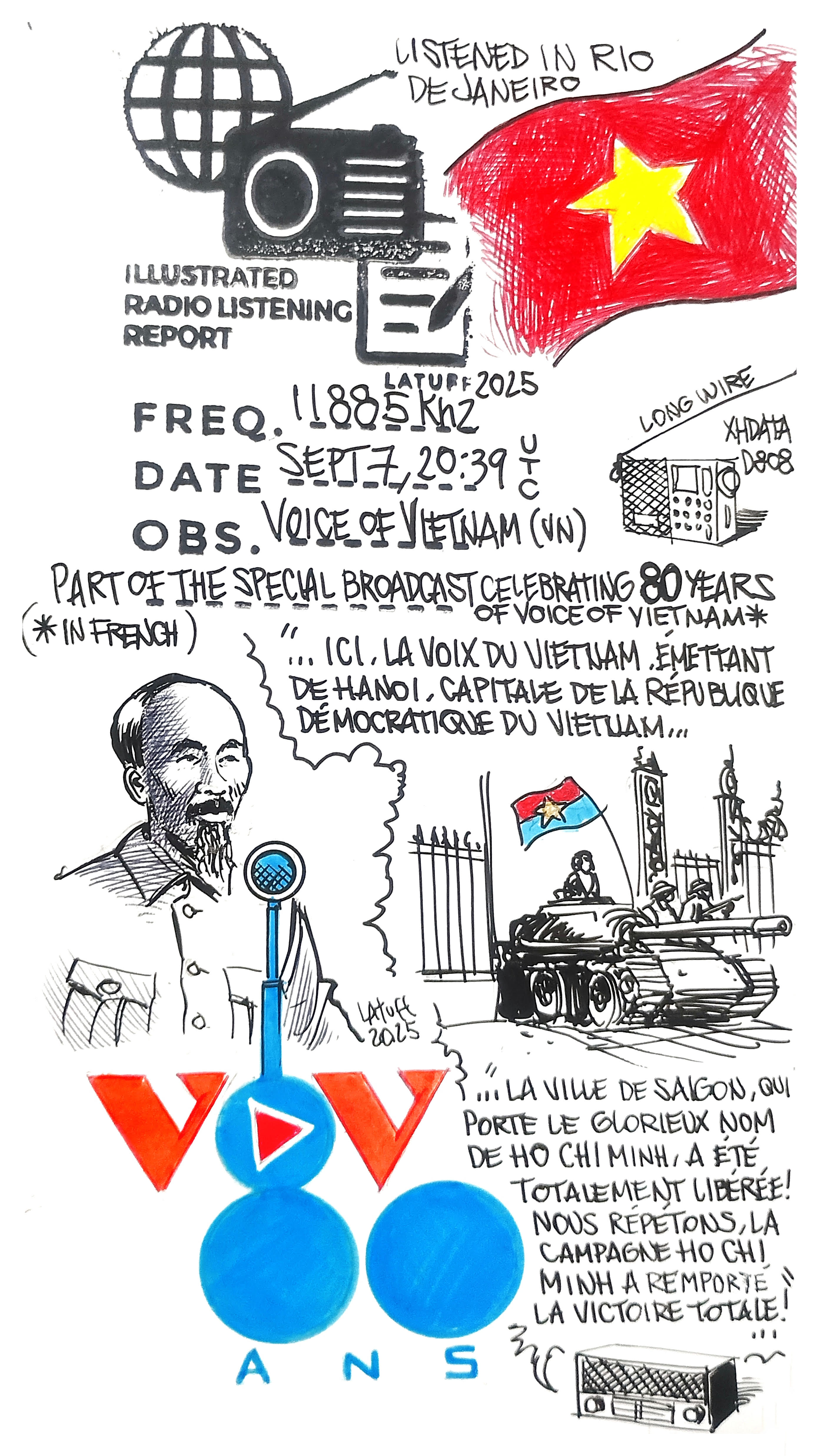 Carlos Latuff, un auditeur brésilien, nous a envoyé un rapport d’écoute en image très originale, réalisé le 7 septembre à 20h39 sur 11885 kHz, accusant une bonne réception.