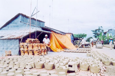 Aujourd’hui, on ne fabrique plus que des petits fours en terre cuite, nous explique Tran Van Tue, propriétaire d’un atelier. Depuis une dizaines d’années, pour travailler la terre, il utilise un broyeur qui lui permet de broyer finement l’argile. Avant cette machine, pour malaxer la terre à la main, il fallait compter deux ou trois jours, aujourd’hui, en deux heures, le travail est terminé.