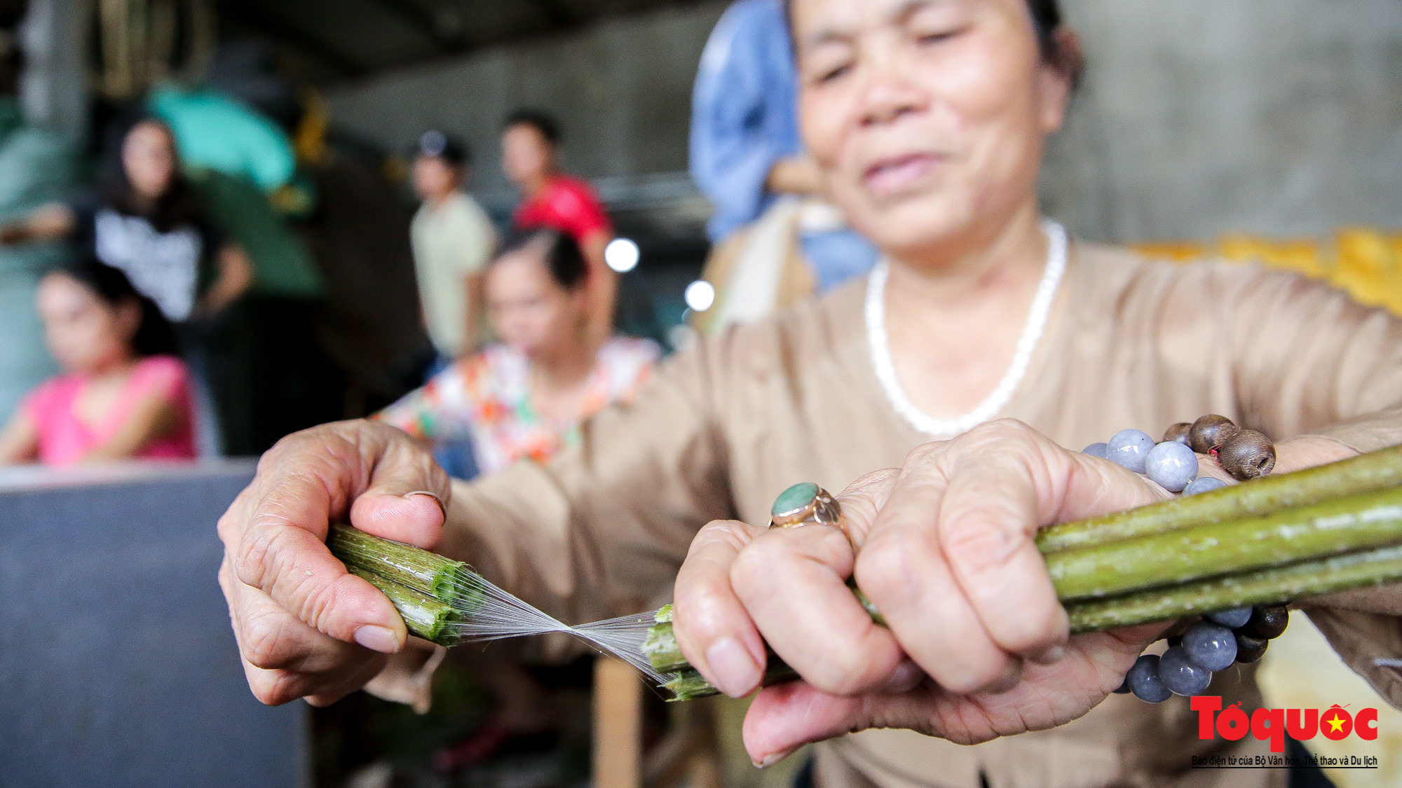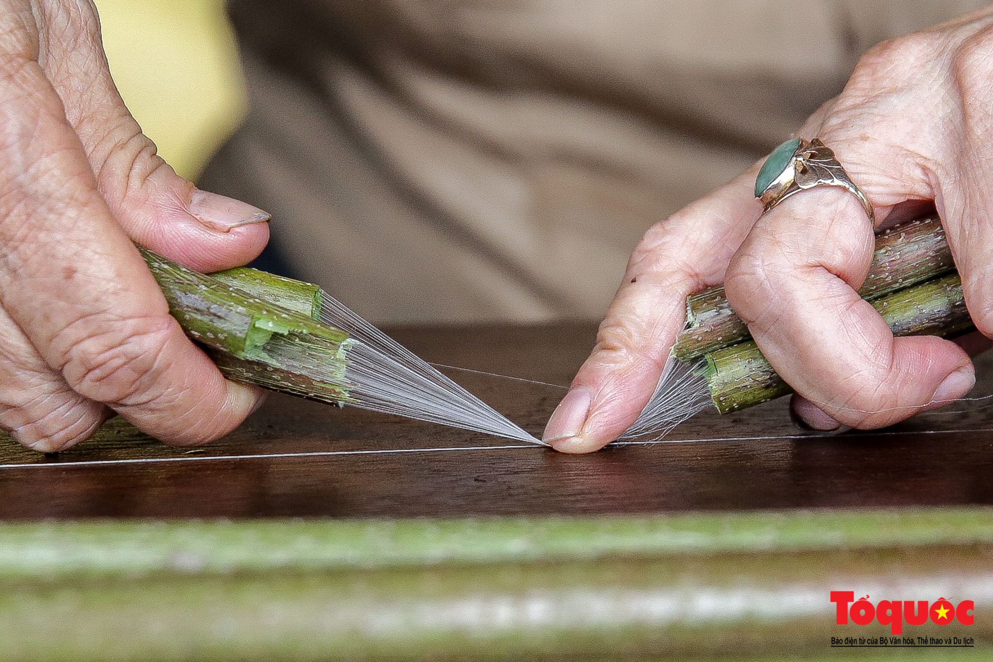 Pour extraire la fibre, Phan Thi Thuân utilise un petit couteau pour faire des entailles autour de la tige, qu’elle casse en deux avant de tirer délicatement les filaments.