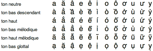 6 signes ont été ajoutés pour indiquer la tonalité de la lettre et 2 signes crées pour former 2 nouvelles lettres. Ces 2 signes proviennent du grec (un point souscrit,un petit point d'interrogation suscrit – signe marquant dans les langues romanes une courbe mélodique particulière)