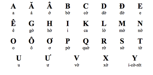 L'alphabet du « quoc ngu » comprend 29 caractères contre 26 pour l’alphabet standard. Les lettres f, j, w, z n’existent pas. 6 signes indiquent la tonalité de la lettre et 2 lettres ont été crées.