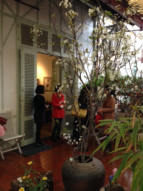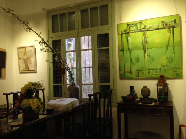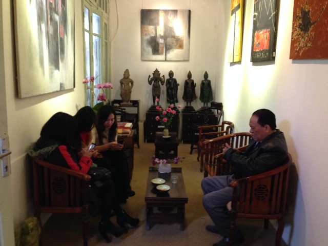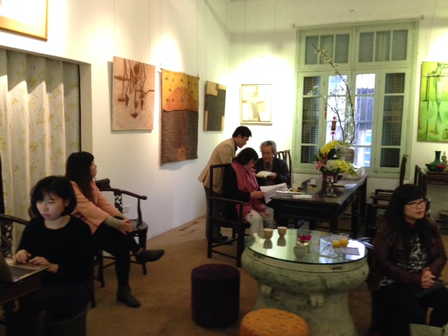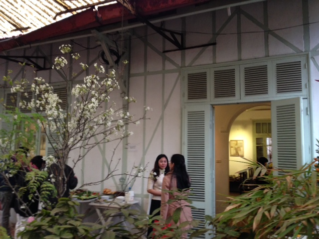 Nous sommes maintenant au 1er étage d’un grand immeuble, attenant à la Cinémathèque. Malgré la bruine, de nombreuses personnes sont venues pour célébrer le 8ème anniversaire de la « maison des Arts » et les 35 ans du retour à Hanoï de Nguyễn Nga.