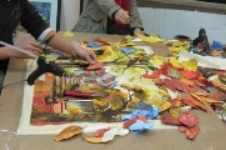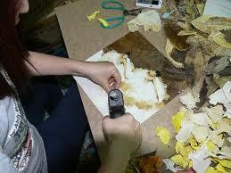Les artistes doivent savoir en premier lieu où et quand ils peuvent trouver des matières premières car toutes les feuilles ne sont pas bonnes à utiliser. Seule l'expérience permet de savoir quelles sont les feuilles qui donneront la couleur souhaitée après traitement. Les feuilles sont choisies d'abord pour leur forme, puis lavées soigneusement. Après quoi, elles sont bouillies. C'est l’étape la plus importante du traitement, réservée aux experts car à chaque sorte de feuille correspond une température et une durée d’ébulition. Cette étape peut prendre entre 2 jours et une semaine. Ensuite, on sèche les feuilles au soleil et on les repasse. Binh Minh : " Le traitement des feuilles mortes est l’étape la plus importante. Il s’agit de faire en sorte que la feuille puisse conserver sa souplesse et sa couleur naturelle. Chaque type de feuille réclame un traitement particulier, notamment lorsqu’il s’agit de faire bouillir. Ca peut prendre jusqu’à une semaine pour obtenir les teintes voulues. Ce n’est qu’après qu’on peut passer à l’assemblage des feuilles pour créer un tableau vivant."
