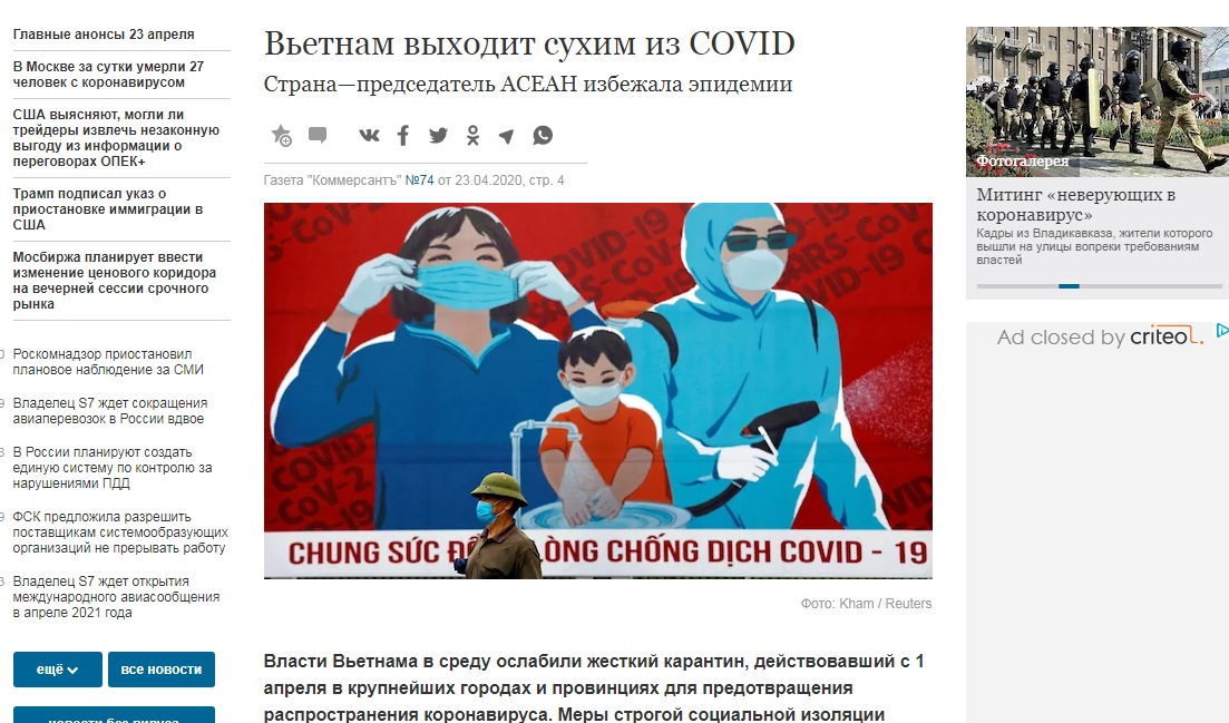 Dans son article du 27 avril, Wall Street Journal explique que le succès du Vietnam procède des méthodes employées comme l’isolement de dizaines de milliers de personnes, le traçage des personnes contaminées et la mise en quarantaine de leurs contacts directs. La rapidité d’intervention du Vietnam a permis de limiter la propagation du virus dans le pays.