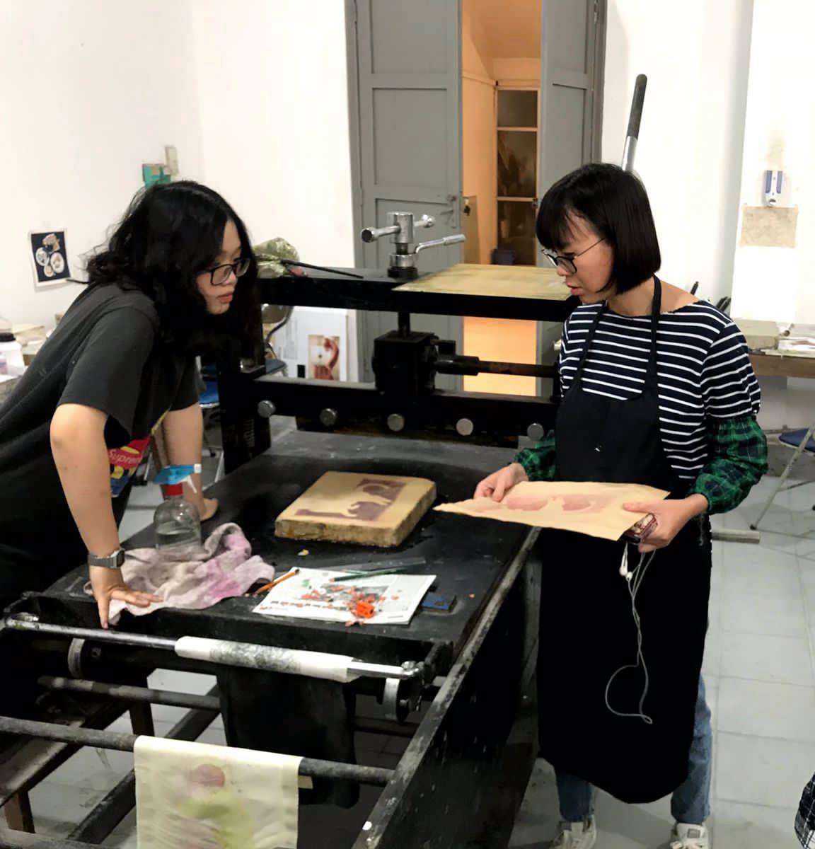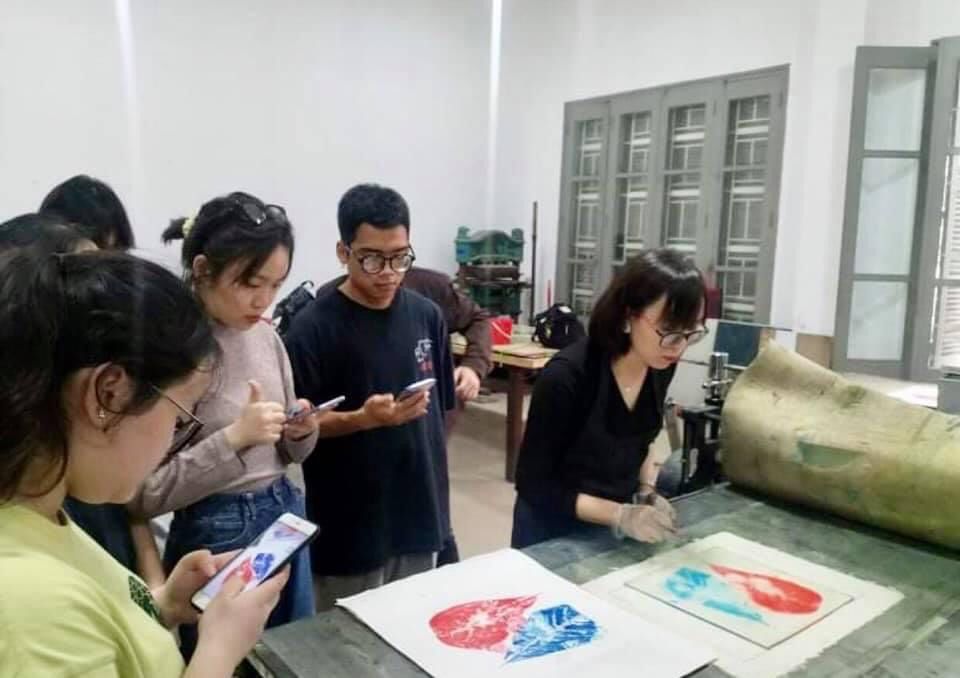 Nguyên My Ngoc (tenue noire) explique à ses étudiants des techniques d'impression d'art | Photo: My Ngoc