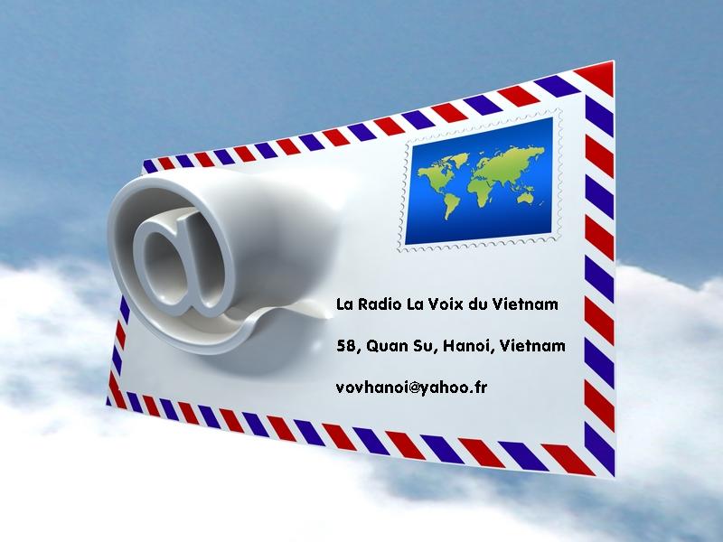Dans la semaine, notre ami français Michel Minouflet nous a écrit, je cite : « J’espère que vous allez bien toutes et tous à la rédaction française de « La Voix du Vietnam ». Je continue à vous écouter tous les jours sur Internet et je suis très satisfait de la réception et des programmes diffusés. Vos émissions me plaisent beaucoup, elles sont très bien conçues et sont très variées. » fin de citation. Cher ami, votre fidélité constitue toujours notre plus grand encouragement. Ecrivez-nous plus régulièrement, donc !