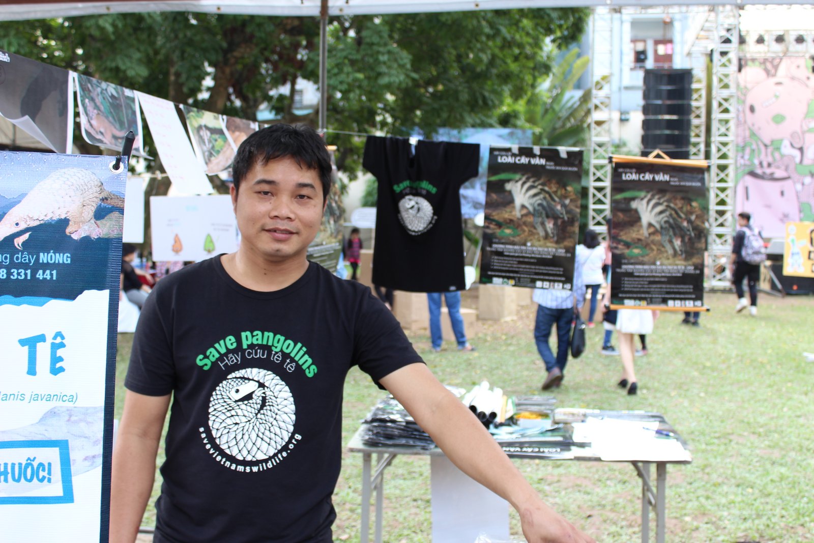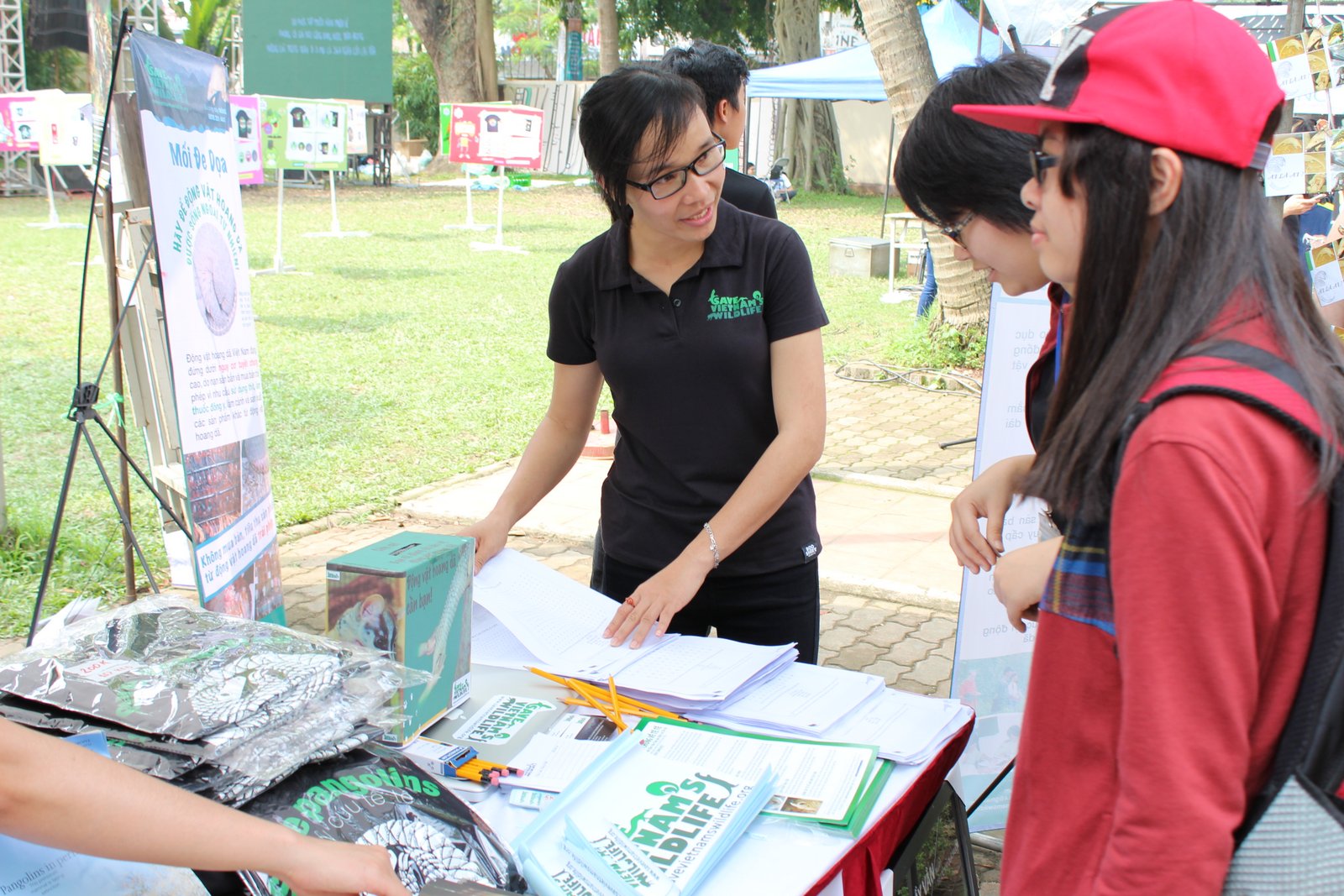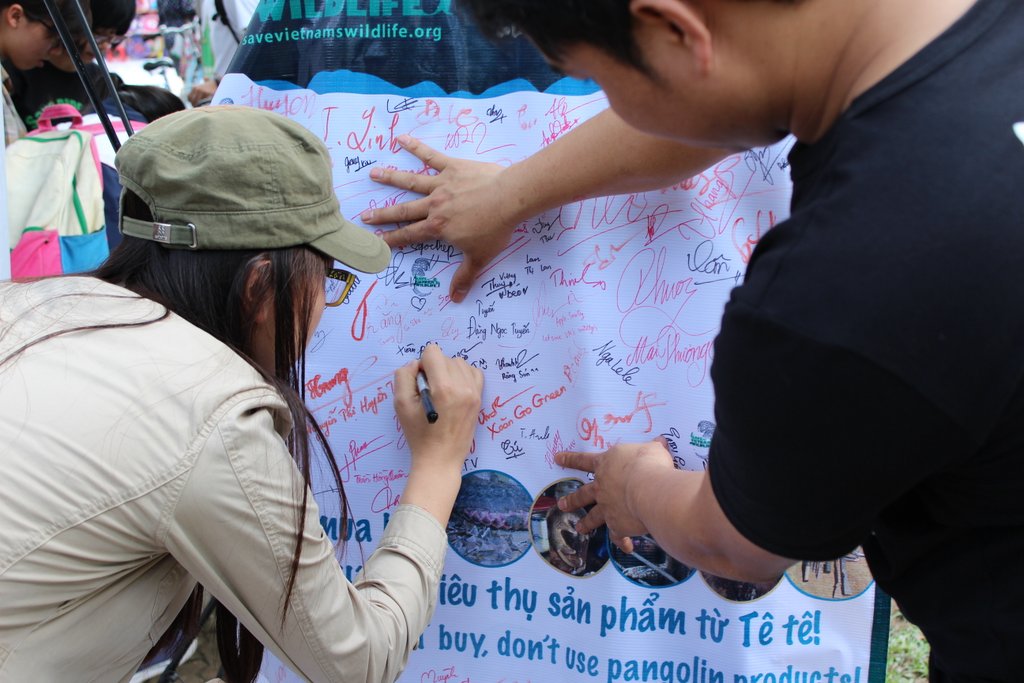 Joignant le geste à la parole, Nguyễn Văn Thái et ses collègues font le tour des fêtes foraines pour sensibiliser, encore et toujours, à la protection des animaux sauvages. Hồ Thị Kim Lan, chargée de l’éducation à la sauvegarde des animaux sauvages: «En plus d’exposer des documents, des affiches et des papillons sur les animaux sauvages, nous vendons aussi des tee-shirts et des accessoires pour collecter de l’argent. Mais ce qui attire le plus, c’est toujours des jeux. Aujourd’hui, nous proposons au public trois jeux. Pour gagner le premier jeu, on doit relier les images de sept animaux se trouvant au parc national Cuc Phuong à leurs noms. Pour le deuxième, il faut identifier le pangolin javanais et le pangolin de Chine - deux espèces de pangolin vivant dans le Nord et le Sud du Vietnam. Quant au troisième jeu, c’est le jeu de mots dans lequel, les participants doivent identifier les animaux étant « en danger » et les cinq combines concernant le trafic ».