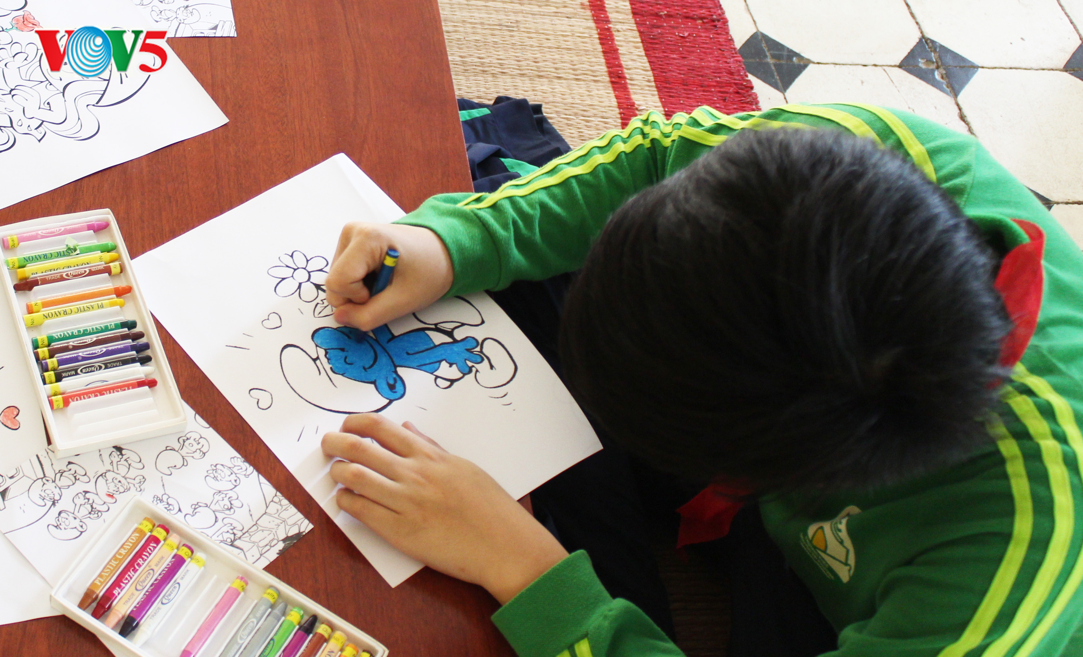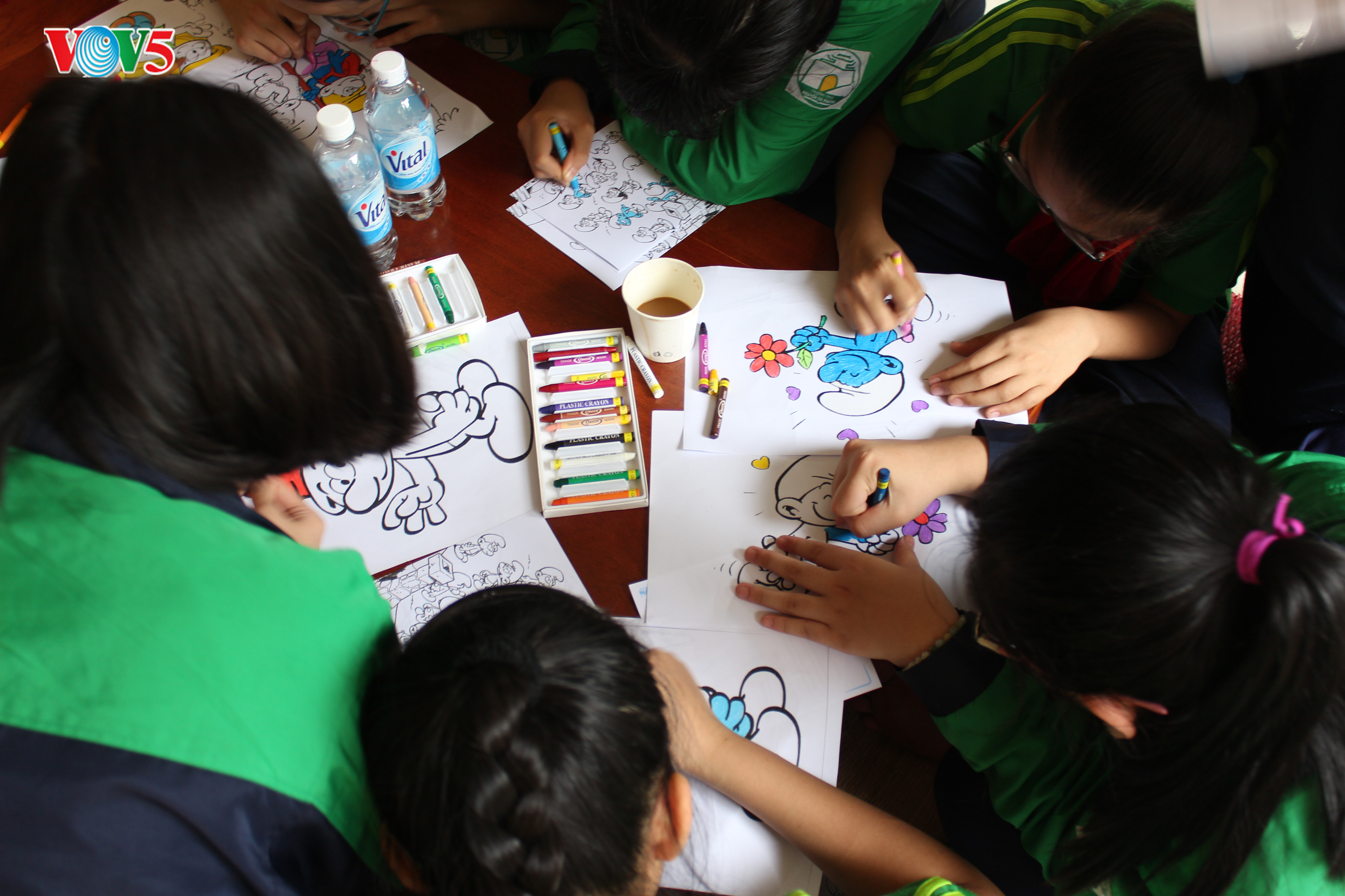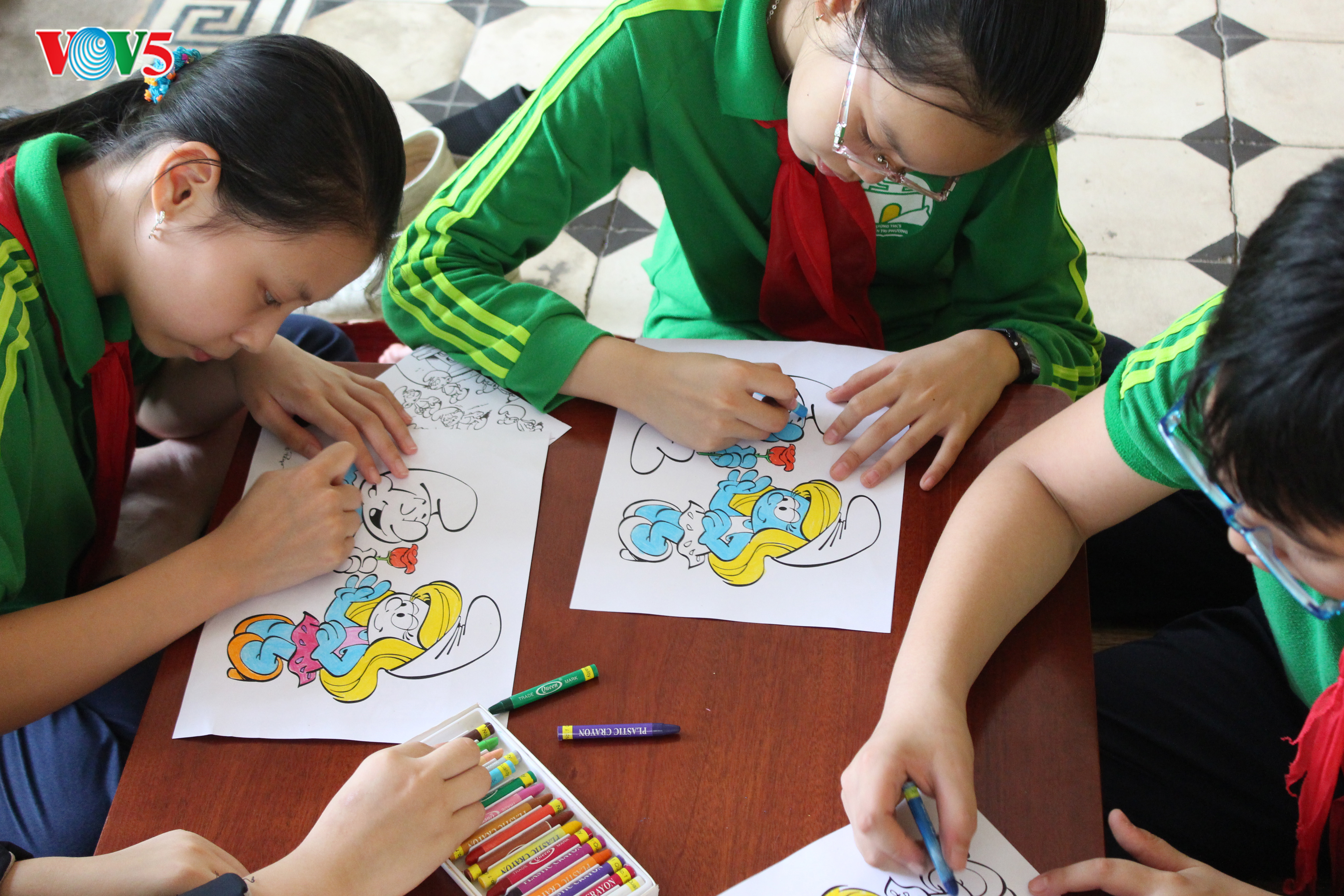 Dany et des élèves lors d'un atelier de dessin sur les Schtroumpfs