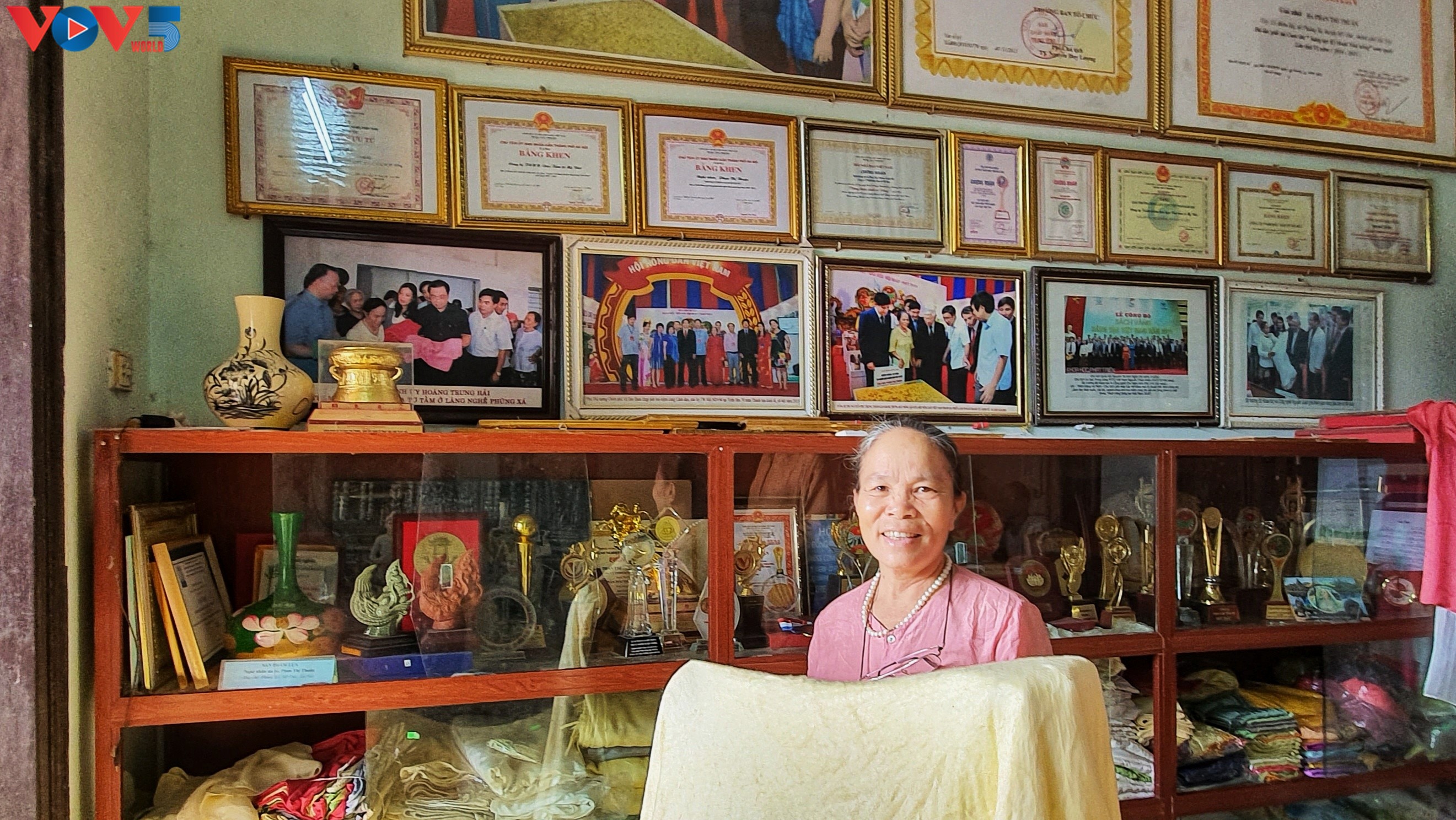 La tisseuse Phan Thi Thuân tient son "tissu non tissé", dans son salon rempli de certificats et de trophées (photo: Duc Quy/VOV5) |