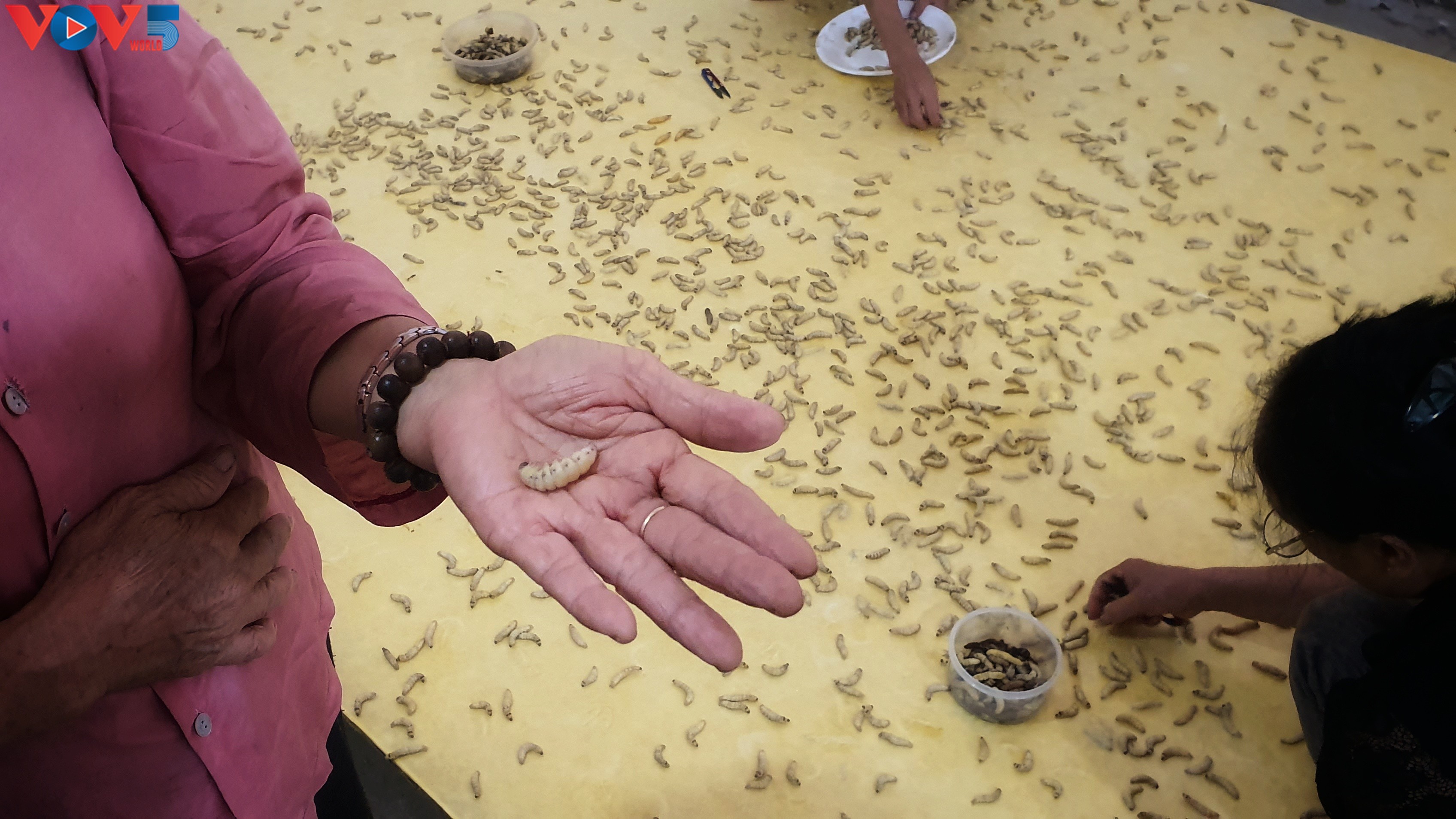 «À leur naissance, on les place dans des paniers remplis de feuilles de mûrier pour qu’ils se nourrissent pendant 17 jours», détaille-t-elle. «Jusque-là, c’est normal. En général, c’est au bout du 20e jour que les vers commencent à produire de la soie. On les dispose alors sur une surface plane, recouverte d’une sorte de colle, de façon à retenir les fils de soie. On fait ensuite bouillir le tissu brut pendant trois heures et demi pour le débarrasser de la colle et le rendre plus moelleux. Cette technique qui consiste en fait à faire travailler les vers directement permet de gagner du temps et de garantir une bonne qualité. Ça marche, en tout cas! Il n’y a qu’à voir la demande. Ça va crescendo!»