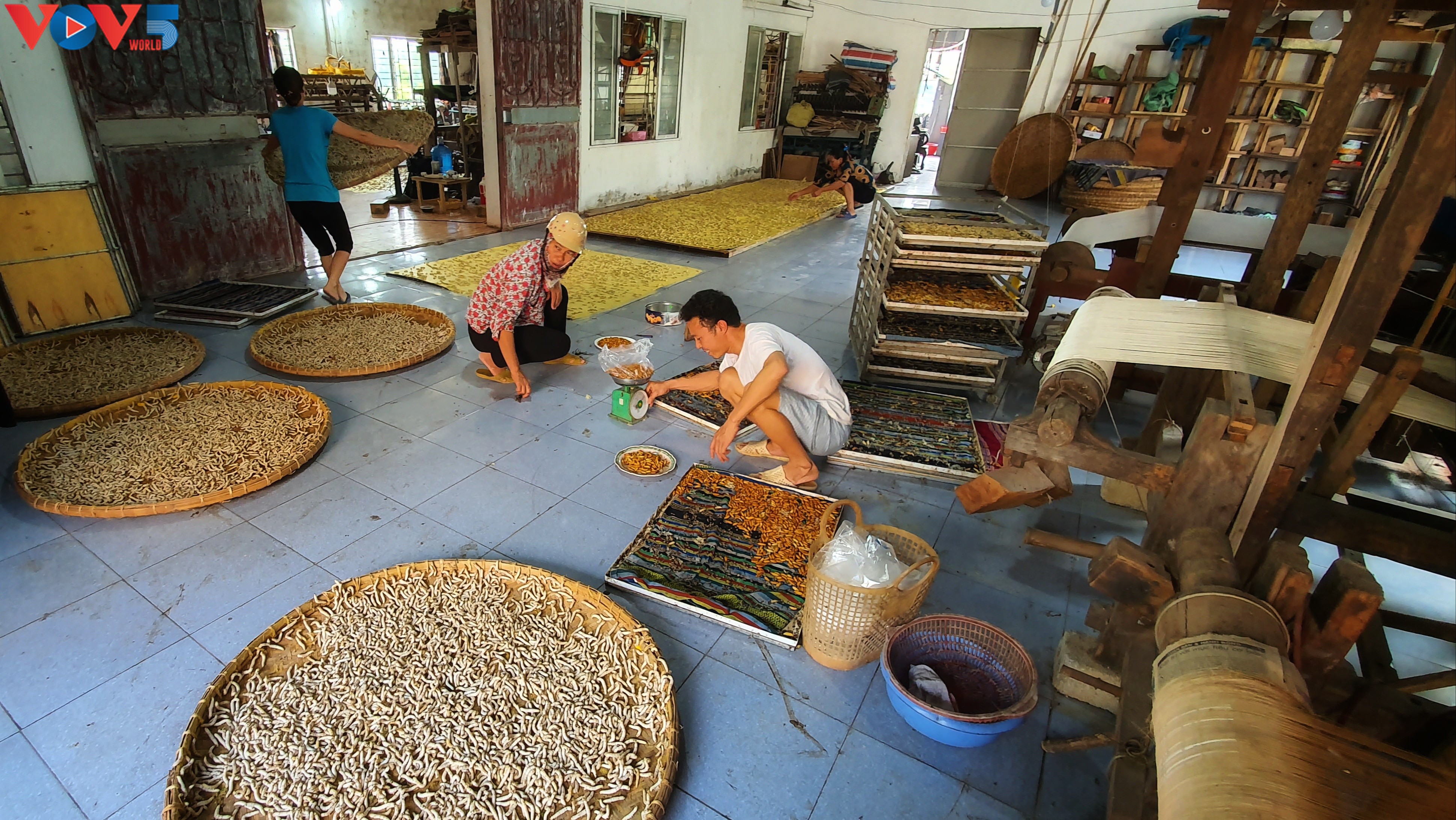 Phùng Xa, donc. Haut lieu de la soierie artisanale… Sur place, la vie est rythmée par les vieux métiers à tisser Jacquard, ces fameux métiers à tisser français qui datent des années 1930 et qui continuent à faire merveille.