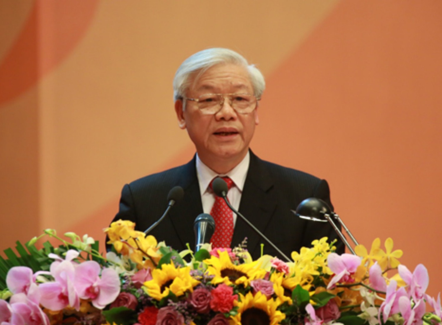 ![]() Le secrétaire général du Parti communiste vietnamien Nguyen Phu Trong (milieu) entouré de journalistes étrangers avant sa visite aux Etats-Unis. |