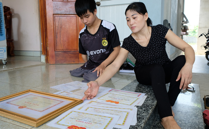 Minh dan ibunya di samping surat-surat pujian yang diraihnya selama proses pembelajaran (Foto: nld.com.vn) |
