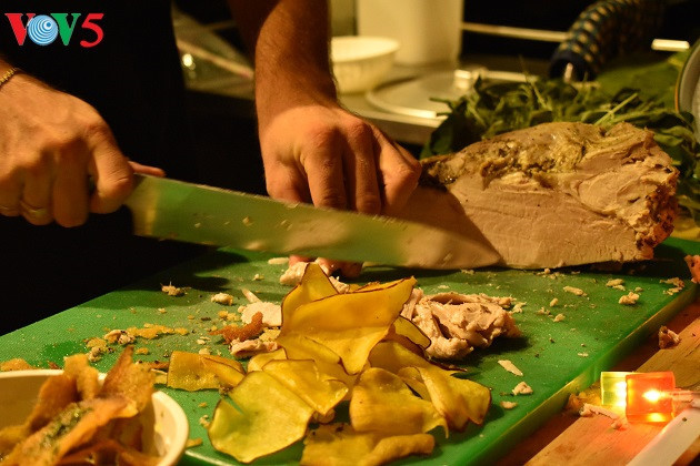 Setiap orang dengan satu tahapan memasak untuk memberikan kepada para wisatawan kesan-kesan yang tak bisa dilupakan ketika datang di Kota Hoi An. |