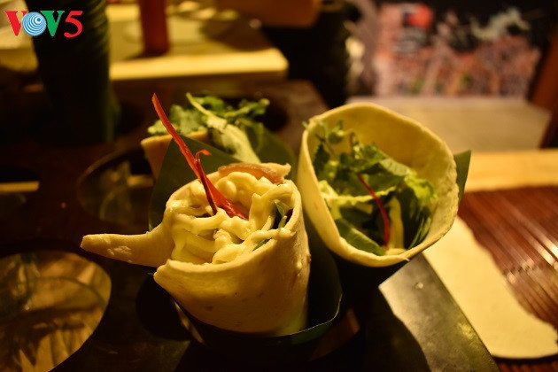 Masakan cao lau dikemaskan dalam kue crepe guna mudah dipegang.