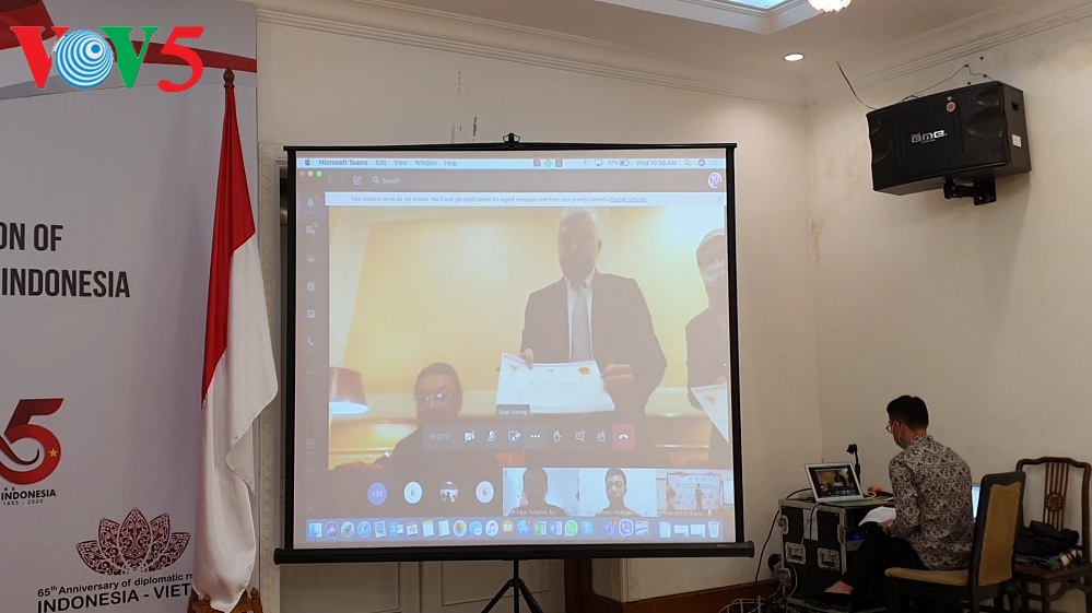 Acara menyampaikan hadirah diadakan secara langsung dan virtual di Jakarta dan Ha Noi (Foto: Huong Tra/VOV Jakarta) |