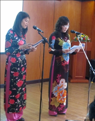 Direktur VOV5- Ibu Doan Thi Trung membaca pidato peresmian (kanan).