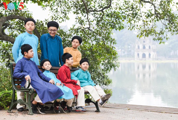 Semakin ada banyak anak-anak yang dipacu orang tuanya untuk mengenakan “Ao dai Ngu than” tradisional. |