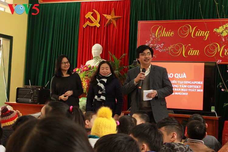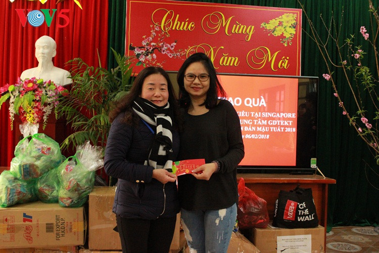 Asosiasi diaspora Vietnam di Singapura telah mengumpukan banyak pakaian dan memberikan angpao kepada anak-anak di pusat. Setiap angpao senilai 200.000 VND. (Foto :dari kiri : Ibu Nguyen Thuy Ha, Kepala badan perhubungan Asosiasi diaspora Vietnam di Singapura, Ibu Pham Thuy Hang, Direktur Pusat dan bapak Hoang VanHuong, Kepala seksi siaran bahasa Vietnam, VOV5) |