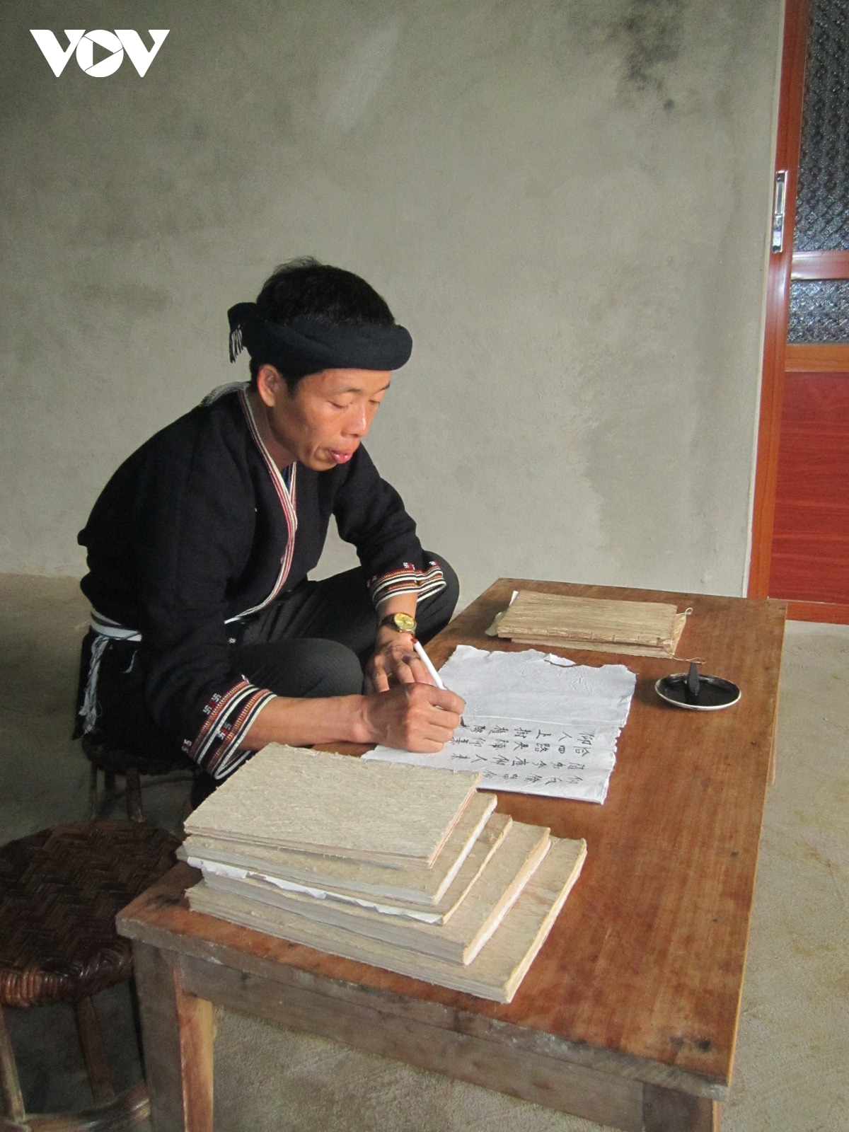 Bapak Ban Van Duc membuka kelas mengajarkan aksara Nom Dao kepada masyarakat (Foto: VOV) |