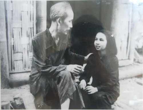 Paman Ho berbincang-bindang dengan Nguyen Thi Thanh, prajurit kompetisi cabang produksi kertas –wakil termuda peserta Kongres prajurit kompetisi nasional pertama |