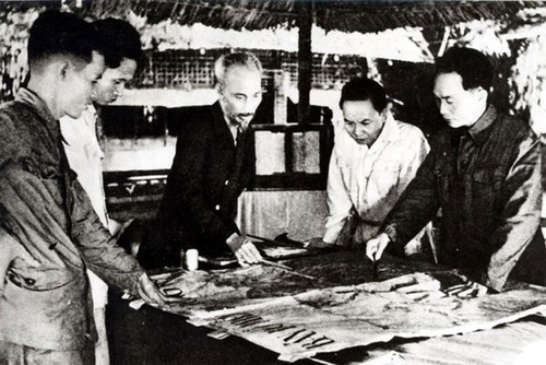 Foto bersejarah tentang perbahasan antara Presiden Ho Chi Minh dan Jenderal Vo Nguyen Giap tentang rencana pertempuran sebelum memulai operasi Dien Bien Phu tahun 1954 |