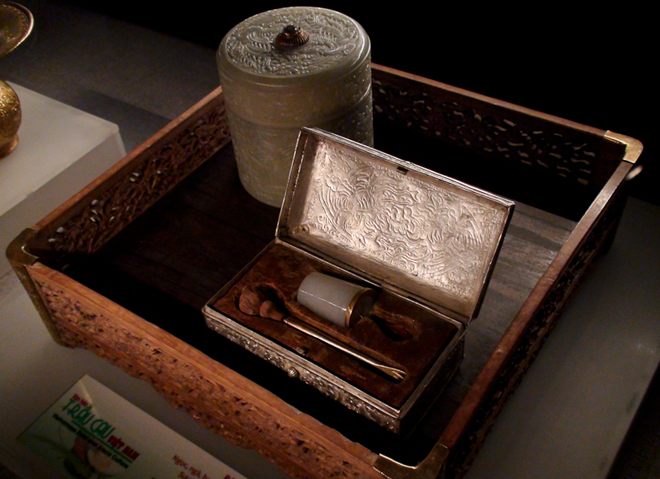 (VOVworld) – Adat istiadat makan sirih merupakan salah satu diantara ciri-ciri budaya yang indah orang Vietnam pada masa lampau. Pisau potong pinang, cobek tumpuk sirih, tepak sirih, botol kapur, ketur dll merupakan benda-benda yang tidak bisa kurang setiap kali makan sirih. Bersamaan dengan Adat istiadat makan sirih, benda-benda tersebut sedang berangsur-angsur aus dalam kehidupan orang Vietnam. Tetapi ketika datang di Museum Sejarah Nasional Vietnam pada hari-hari ini, kita akan melihatnya pada pameran dengan tema “Budaya sirih pinang”, melalui itu kita bisa mengetahui budaya sirih pinang orang Vietnam masa lampau.