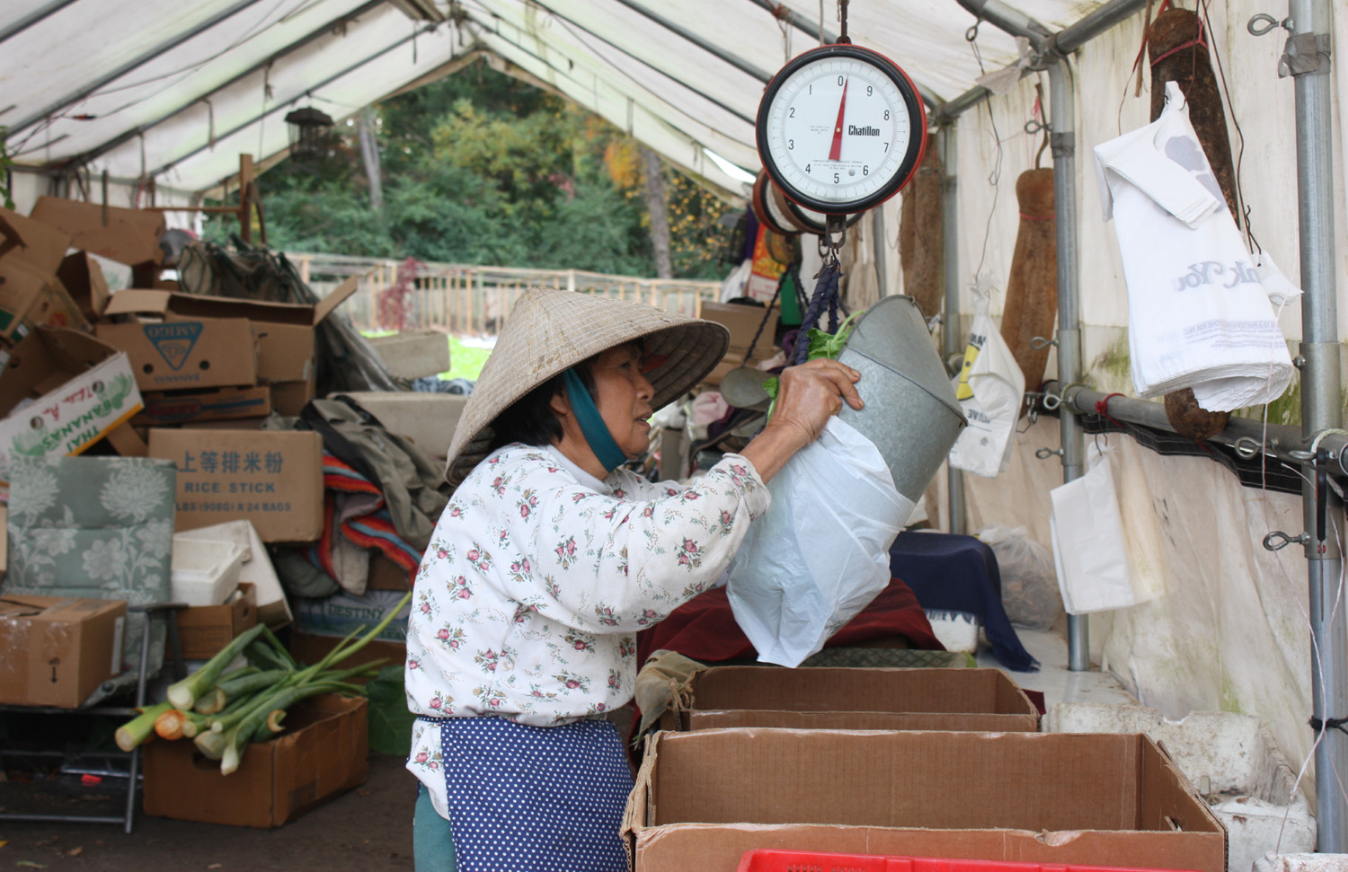 Ibu Boc menimbang sayuran untuk pelanggan