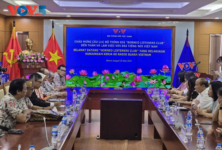(VOVWORLD) - Sehubungan dengan ulang tahun ke-58 Program siaran bahasa Indonesia, Departemen Siaran Luar Negeri (VOV5), dari tanggal 28 Juni sampai 2 Juli, Borneo Listener Club (Indonesia) yang beranggotakan 19 orang melakukan kunjungan di Vietnam, melakukan temu kerja di Radio Suara Vietnam (VOV). Kunjungan dengan nama “DX Tour V Vietnam” ini bertujuan untuk mempererat hubungan persahabatan antara pendengar dan VOV, memperkuat silaturahmi rakyat antara dua negeri Vietnam-Indonesia.